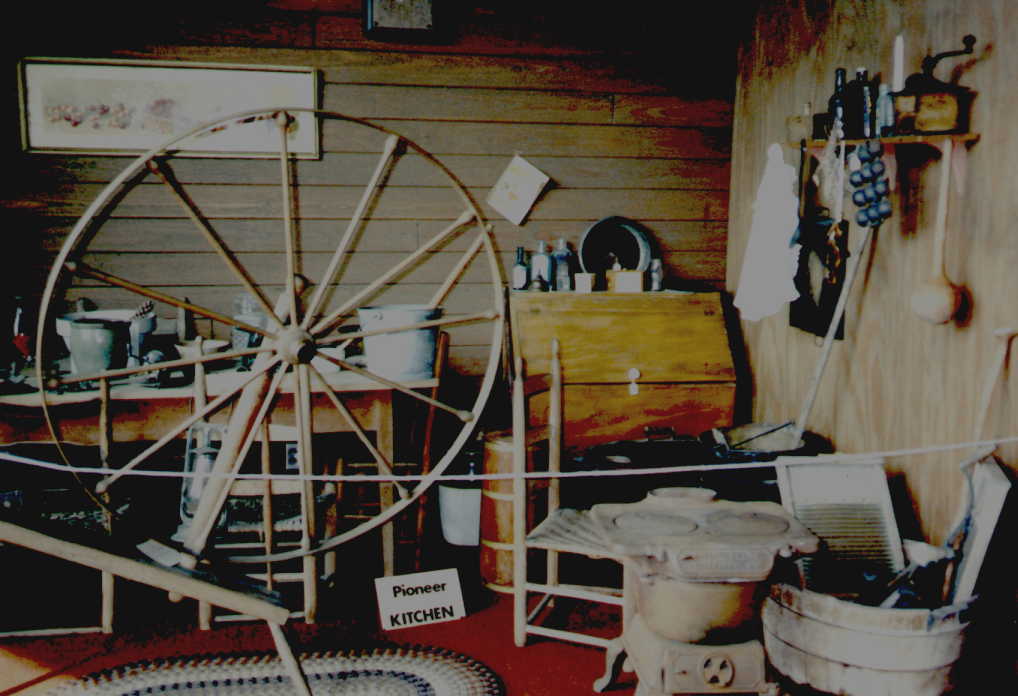 The kitchen has many common items such as crocks, stoves, glass bottles, rabbit ear spinning chairs, and a spinning wheel.