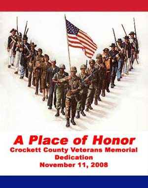 To further emphasize its maintenance and upkeep funding, Crockett County Veterans Association established a “Friends of the Memorial” in April 2011. Qualified members receive a Veterans Memorial commemorative coin which reflects its dedication date of November 11, 2008; and, those who join before November 2014 will be recognized on a plaque which will be dedicated on Veterans Day 2014.