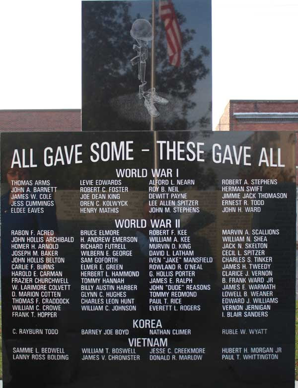 The Memorial was dedicated on Veterans Day, November 11th, 2008, a mere 15 months after the initial committee meeting. Out of county donations were received from states such as NC, VA, AL, CA, AZ, MS, GA, & FL. By the end of 2008, almost $70,000 had been collected. The tablets for the Memorial cost $46,000. Another $9,000 was spent on such things as site preparation, concrete, sod/landscaping, advertising, & programs. The cost to add 381 additional names in 2009 and 2010 was $19,000. Names are added each October. The Memorial committee continues to meet to discuss such items as security, maintenance & upkeep of the memorial, fundraising for its perpetual care, adding of names, and photos for the internet site. If you know of a name omission, please contact Ira Burrow, at 731-696-5464, or email at:ibcso@crockettnet.com.