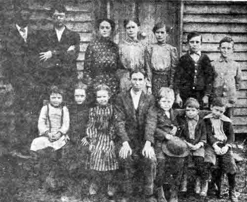 SCHOOL DAYS — At old Lunsford School were, left to right, front row, Lena Tyler, Ola Mays, Lavada Rhodes, Hurst Jennings (teacher), Howard Campbell, James Leonard Tyler, Gordon Elvington. Back row, left to right, Lonnie Hill, Alton Garrett, Bertha Maya, Clyde Rhodes, Melissa Lunsford, Everett Elvington, and Rufe Mays.