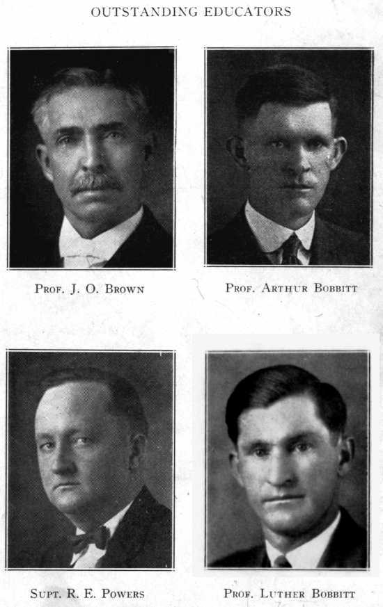 - Photographs, Outstanding Educators: Prof. J. O. Brown; Prof. Arthur Bobbitt; Supt. R. E. Powers; Prof. Luther Bobbitt [Note: Damaged Luther Bobbitt photo replaced with scan from a xerox copy.]