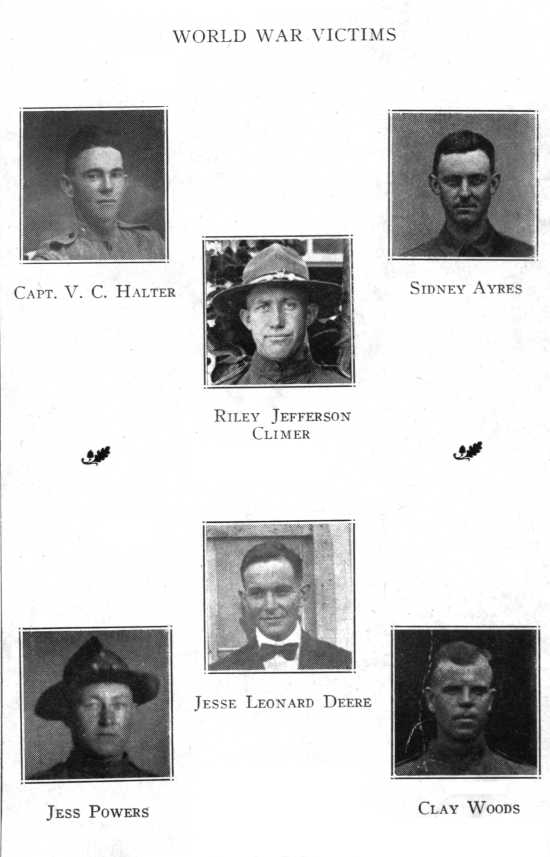 - Photographs, World War Victims: Capt. V. C. Halter; Riley Jefferson Climer, Sidney Ayres, Jesse Powers, Jesse Leonard Deere, Clay Woods