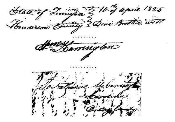 It has been stated in print that Red Mound received its name from Red Mountain, a post office and community in what is now Durham County (formerly Orange County) ,North Carolina, the back-home of the Carringtons, one of whom, WILLIAM DAVIS CARRINGTON, became postmaster at Pleasant Exchange in 1831. (He and his family settled there in 1824.) Indeed, a letter written by WILLIAM D.CARRINGTON (born 1813), from Pleasant Exchange to his brother, NATHANIEL MACON CARRINGTON of Orange County, dated April 10, 1825 has been unfortunately quoted as having borne the addresses: To NATHANIEL M. CARRINGTON, Red Mountain, North Carolina, From WILLIAM D. CARRINGTON, Red Mountain, Tennessee. This is purely a fabrication, as a copy of the original letter reveals, which is in the Carrington Papers, those of the late Dr. EVELYN M. CARRINGTON, in the Texas State Library in Austin, Texas. This letter was sent from Henderson County, Tennessee to Orange County, North Carolina and by courtesy of this library the vital parts of the 1825 letter are here reproduced — first the writer's address and date, then the writer's signature, followed by the name of the person to whom the letter was addressed and his address: