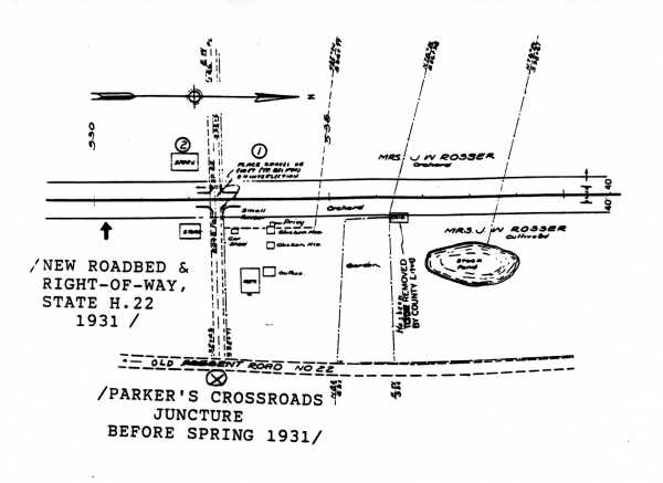 The actual highway plans showing the relocation of the old road is reproduced on the next page to illustrate the changes made. Dr. Parker's old residence was located just to the east of the highway designated on the map as "old road no. 22" between what is presently a bank building and the post office on the north side of the Wildersville highway at Parker's Cross Roads.
