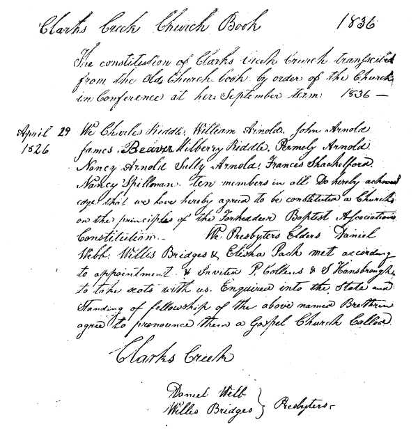 Clarks Creek Primitive Baptist Church is one of the oldest Christian congregations in west Tennessee. It was an outgrowth, an "arm" to use the old-time term, of Middle Fork Primitive Baptist Church constituted August 12, 1823, in a location still in Henderson County. Several of the members there, the Arnolds and Shackelfords, were among the charter members of Clarks Creek Church. (The church's first minute book, page 6; in custody of Houston Carroll, present church clerk, Henderson, through whose courtesy the present writer was able to study the minutes for this sketch; hereafter cited as Min Bk l.)