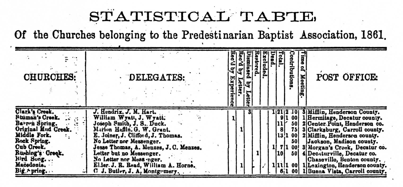 At the Association meeting held at Rocky Spring; Meetinghouse, in Madison County, October 6-8, 1838 the member congregations and messengers, i.e. delegates, were listed: