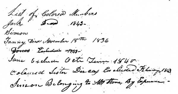 Simon, servant of Isaac Stone, was admitted to membership, July 1844 (page 61) Patsy, a servant of A. McGee and Mariah, servant of "Mr. "Hart, were admitted as members, June 1851 (page 101). The slave Dorcas, was excluded in July 1836; restored in July 1838; early in January 1843 she ran away from her master, according to her for the reason that she wished to join her husband, for which she was excluded in February 1843 (page 45).