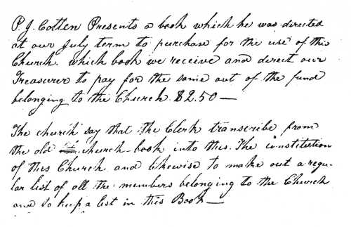 The congregation wanted to retain the land whereon the old meetinghouse stood because they had used some of it as a cemetery. "Brother Jonathan Crook agrees to make a title to the land whereon the meeting house now stands, according to former survey of sd. land and the title to be given to the officers of the church." (October 1836) (IBID., page 8) "Brother Jonathan Crook agreeable to promise at our last October meeting now makes this church a title to the land whereon this meeting house stands containing ten acres more or less." (May 1837) (IBID., page 10)