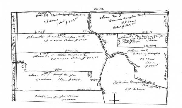 In May, the commissioners set apart 28 acres each to seven of the heirs, making adjustments among them the values of their lots, providing them all with equal financial value. Henderson Douglass was by agreement allowed the gin lot, 17 acres, located apart from the rest of the farm and also 11.5 acres of the regular farm, constituting share one. Share two, 28 acres went to Irvin Douglass. Share three, 28 acres went to Mamie Meban. Share four, 28 acres went to Amalee Williams. Share five, 28 acres went to Rebecca Seats. Share six, 28 acres went to Willie Cathey. Share seven, 28 acres went to Pomp Douglass. 260 acres, including the Cato Douglass tract, the Campbell tract and a small tract near Rheuhannah (Ruhamer) Church, were to be sold by the court and the proceeds divided among the heirs. (IBID., page 102) This plan of division was submitted to the county court in mid-May 1923 and it was accepted by the court by decree, July 23, 1923. (IBID., pages 92-106)