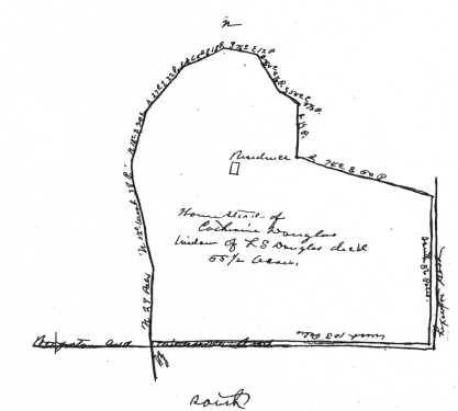 On May 7, 1923 these three commissioners, including J. W. Ballard, surveyor, went upon said lands and set aside "these lots except for Silvester and Ora Henry who chose to receive money shares instead of land. They reported that Dr. Douglass "had been married four times, that his first and second wives died many years ago, being the mothers of the above-named children; that he was divorced from his third wife, had no children by her and that he left as his widow, the fourth wife, Catherine Douglass who is entitled to homestead and dower in said tract of land." On the previous March 26, the commissioners set apart the homestead, 55.5 acres, including the family residence and a dower to the west of it of 49.1 acres, to Catherine Douglass, all valued at $1000. (IBID., pages 104-105)