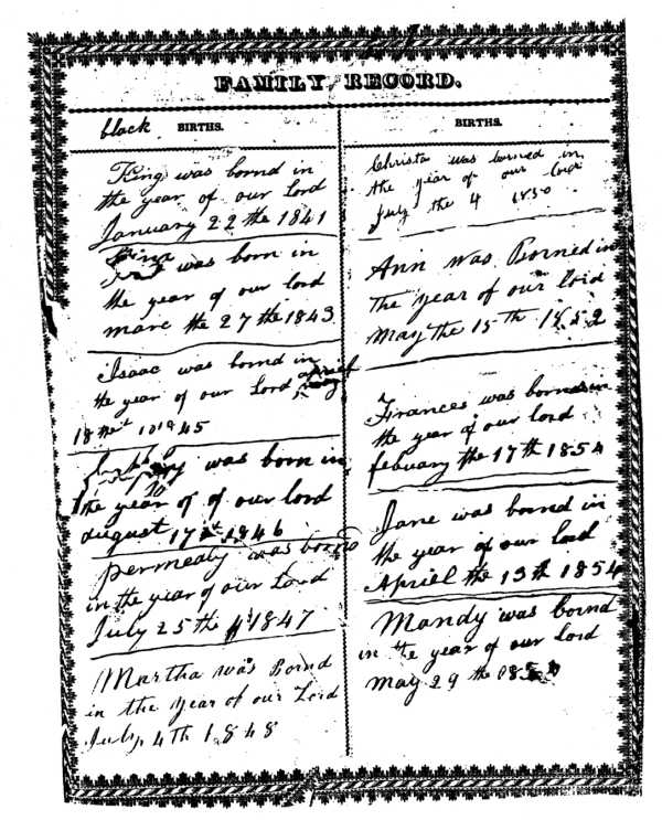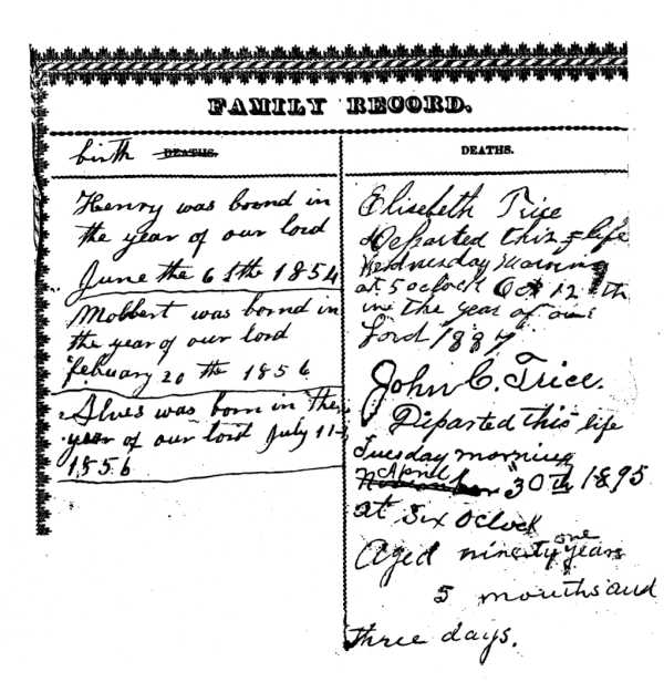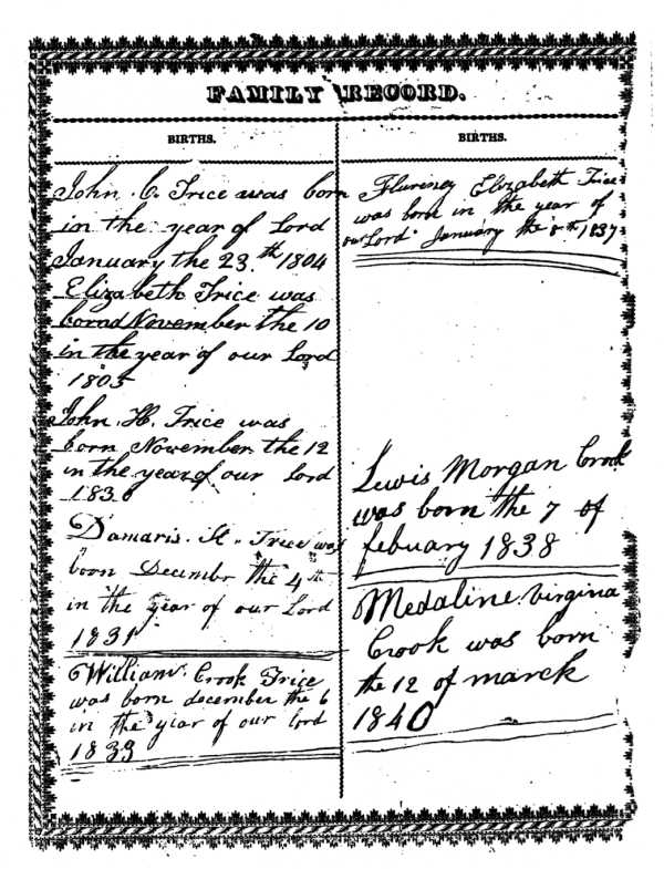 The family data pages in the 1829 Trice Bible are reproduced here, courtesy of its present owner, Martha Rebecca Christopher Woods, Henderson, Tennessee (including the births entered of several of the Trice slaves):