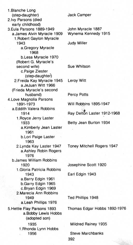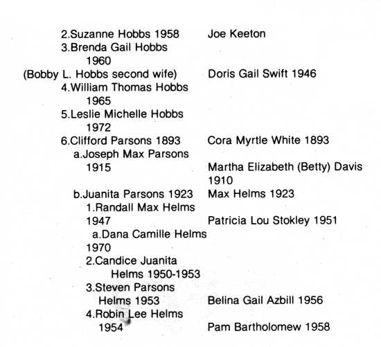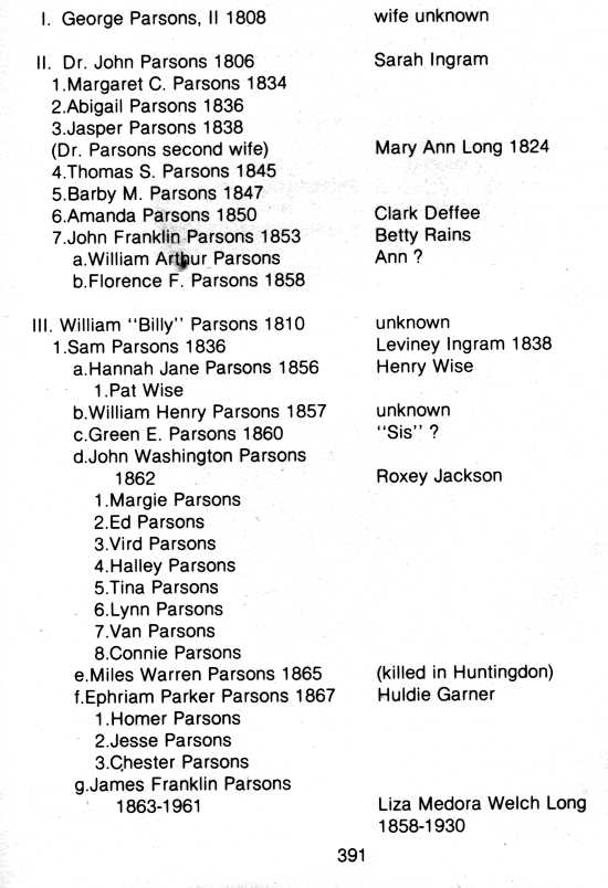 Most Parsons' descendents were not very prolific and as is often the case, many re-located in other counties and states after they were grown. These facts make it somewhat difficult to trace parts of the family history.