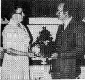 On June 24, 1977, Mrs. Sophia Townsend was given special recognition for 50 years of service as church pianist and organist. Mrs. Townsend began serving in 1927 and resigned in 1977, but still serves as a substitute when needed. Mrs. Sophia was praised for her faithfulness, her co-operative spirit, and for her devotion to the task. In addition to her duties at the keyboard, she taught several classes. An engraved tray and a dozen red roses were presented at the recognition service.