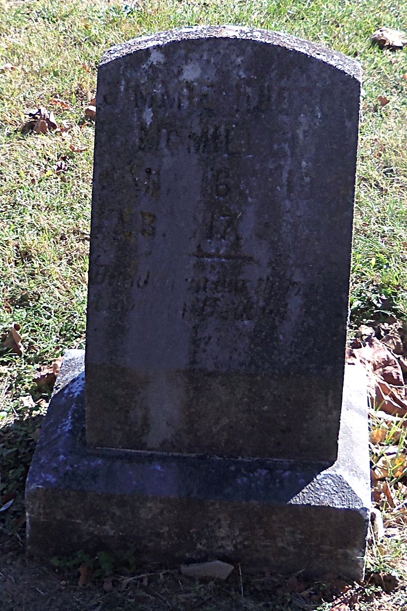 Jimmie Hudson McMillen was the son of George and Bertha Harvey McMillen. In the 1910 DeKalb Co, TN Census he was 3 months old. There is an inscription on the stone.