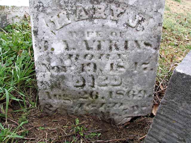 | Atkins | Mary J. | Nov 19 1847 | Aug 26 1869 | headstone photo 1, photo 2 | w/o J. A. Atkins |