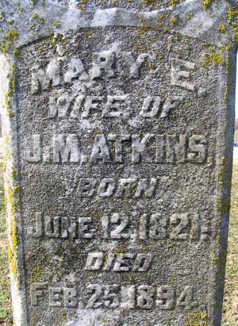 | Atkins | Mary E. | Jun 12 1821 | February 25 1894 | headstone photo 1, photo 2 | w/o J. M. Atkins - on same stone |