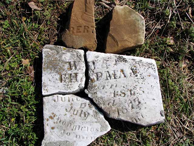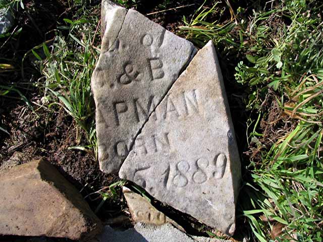 | Chapman | -------- | Jun 1 1868 | Jul 1 1877 | headstone photo 1, photo 2 | c/o W. W. & C. Chapman - broken stone |