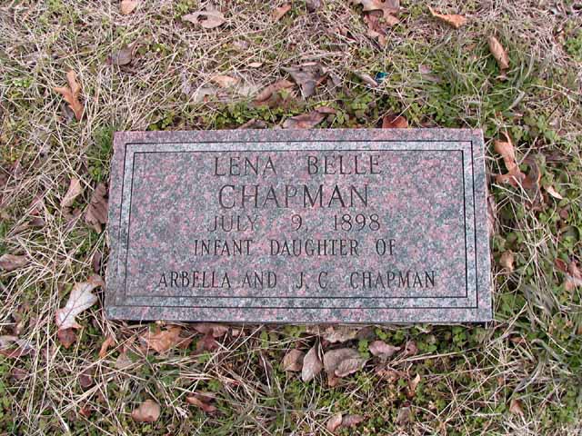 | Chapman | Lena Belle | ---- | Jul 9 1898 | headstone | infant d/o Arbella & J. C. Chapman |