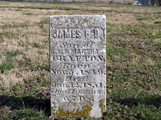 | Crafton | James P. D. | Nov 5 1849 | Jan 12 1851 | headstone | s/o R. L. & Martha Crafton |