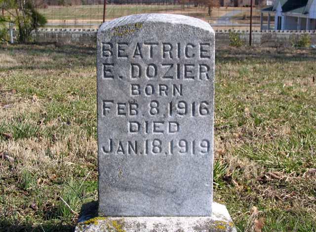 | Dozier | Beatrice E. | Feb 8 1916 | Jan 18 1919 | headstone | |