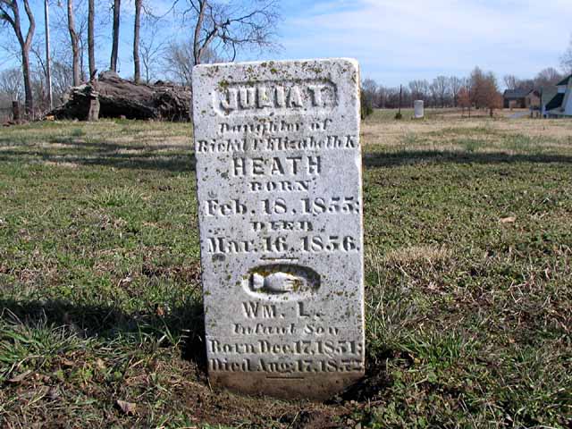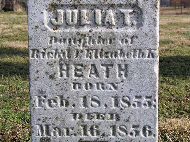 | Heath | Julia T. | Feb 18 1855 | Mar 16 1856 | headstone photo 1, photo 2, photo 3 | s/s as William L. Heath; d/o Rich'd & Elizabeth K. Heath |