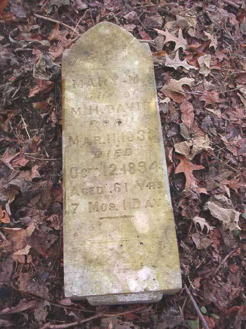 | Davis | Mary M. | Mar 11 1833 | Oct 12 1894 | headstone | w/o M. H. Davis |