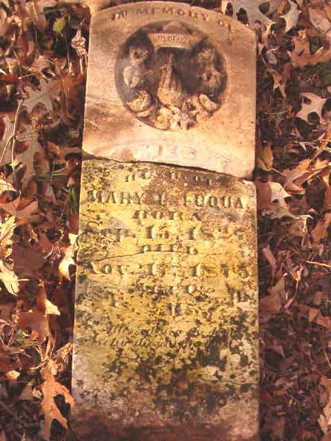 | Fuqua | James F. | Sep 15 1827 | Nov 17 1875 | headstone photo 1, photo 2, photo 3 | h/o Mary L . Fuqua [Children of James F. & Mary L. Fuqua: Eliza J. b. Apr 1 1862 d. Apr 15 1908; Martha (Mattie) b. 1865 d. 1898; Mary Ellen b. Sep 1866 d. Oct 31, 1924; Sabella Eviline b. 1867 d. 1881; John Ashley b. Oct 1869 d. 1921; Annie Myra b. May 30 1872 d. Feb 16 1958] |