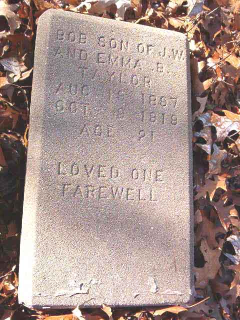 | Taylor | Bob | Aug 19 1887 | Oct 3 1919 | headstone | s/o J. W. & Emma B. Taylor t |