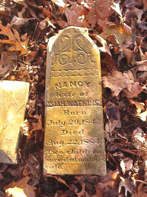 | Watkins | Nancy | Jul 20 1842 | Aug 22 1884 | headstone | w/o Isiah Watkins, two children buried at Mother's side |