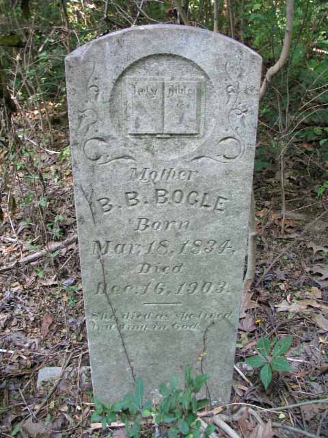 | Bogle | B. B. | 18 Mar 1834 | Dec 16 1903 | headstone | Mother [Blosie Belle Christie Williams Bogle. Her first husband was John James Williams, the second was R. E. Bogle. She was the d/o Abishae Christie and Rebecca Jane Hadley] |