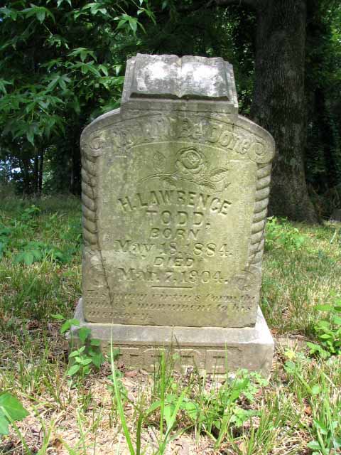 | Todd | H. Lawrence | May 18 1884 | Mar 7 1904 | headstone | His many virtues carry the noblest monument to his memory |