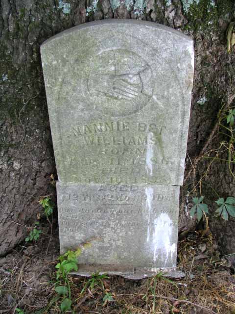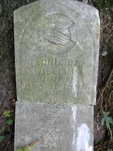 | Williams | Nannie Bet | 11 Aug 1886 | 10 Nov 1898 | photo 1, photo 2 | 12yrs 2 mo 29ds - Our darling one hath Gone before to greet us on the Blissful shore [d/o Preston Williams and his first wife, Nancy Jane Summitt] |