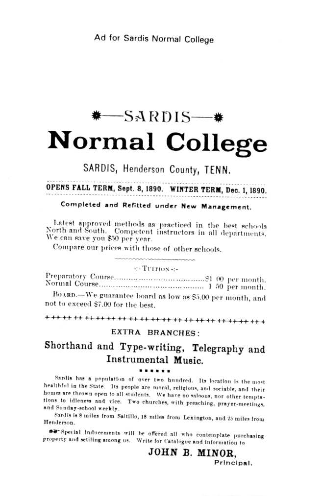 At one time, there were 200 boarding students from other counties in attendance at Sardis Normal College. At that time, it was the outstanding school in this area of West Tennessee. It remained a thriving educational institution until about 1910. At that time, because of political division, the college work offered at Sardis was moved to Martin, Tennessee, to become a part of a higher educational system.