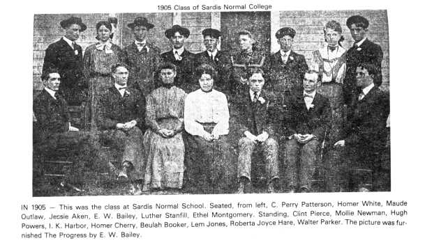 The people of Sardis then, as they have continued to be, were educationally minded. The building completed in 1882 or 1883 was the first Sardis Normal College building. The school, in addition to the elementary grades, offered a preparatory course or a teacher's course, academic and scientific courses which allowed students to earn degrees that qualified them to enter a higher educational institution. The school continued to grow but the building burned down in 1895. The people were saddened and discouraged. Some even wondered if they would ever have such a school again. But when summer came the people called a meeting to decide on what they should do in regard to providing educational and cultural opportunities for their children. After some discussion, they agreed that the people of the town would build another school building. They began to raise funds, committees were appointed, and work on the building soon began. A much larger and nicer building was erected on the same location. After a few years, the people realized a need for a still larger building. The town had increased in population, more homes had been built, the reputation of the college work spread to other counties and more students were coming to Sardis from these counties. By 1904 the town had raised funds and completed the old twostory brick building near where the present school building stands. Then they sold the frame one built in 1895 to Mr. and Mrs. M. F. Pierce who ran a hotel for some time in it.
