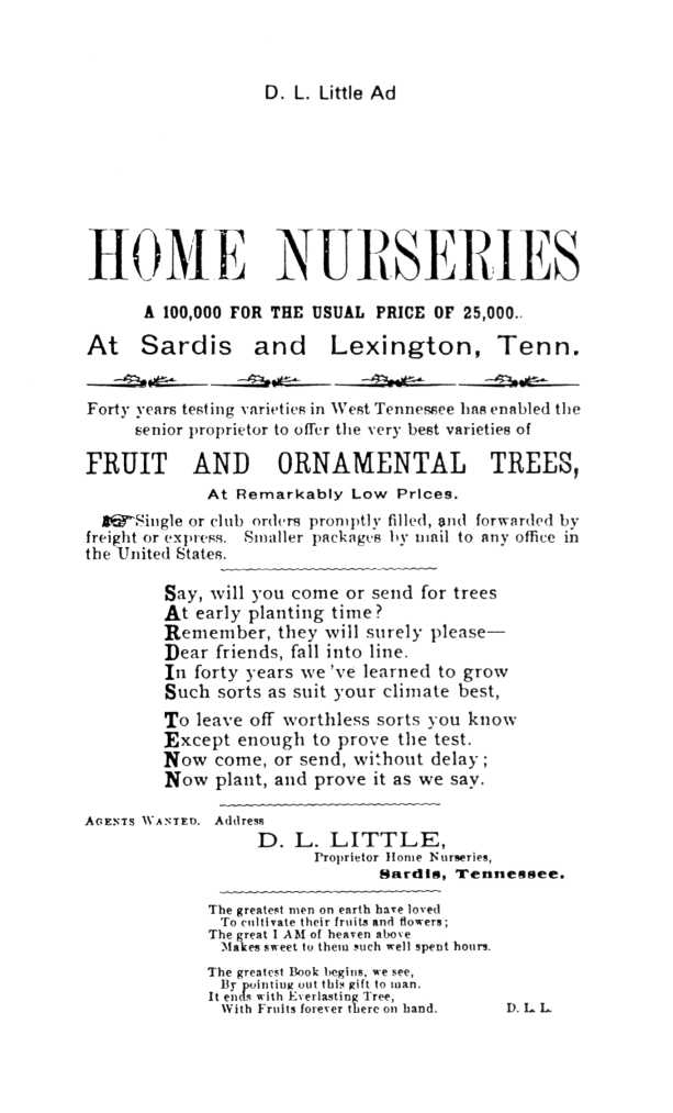 Mr. Little was a versatile man. He was a nurseryman and also wrote poetry. He expanded his nursery and established a branch in Lexington, Tennessee. This branch was operated by Flavial Azbill. He enjoyed poetry and wrote poetry, which he used on his shipping tags and in his ads. The following is an example: