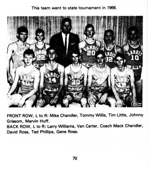 "We roller skated in the gym for the next two or three summers, thus making quite a bit of money. We then bought things our school needed that we were unable to get money from the county to buy. Everyone working together made it possible to have a stronger school program. While I'm on athletics, I'll mention that we had real good basketball teams several different years during that 10-year period. But our best year was in 1966 when we went to the state tournament. And of course, having good basketball teams helped put a focus on Sardis School and that drew some transfers, and at the risk of sounding repetitious, we were working for more students. All these things that we did to attract students just made our school that much stronger.