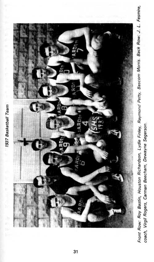 Boys' basketball was first introduced at Sardis about 1918. The first game was around 1920. Some of those first players were Buford Benson, Connie Montgomery, Clarence Rogers and Clyde Little. A few years later girls became basketball devotees. It was a shock to some people to realize girls were going to participate in this sport. Some thought black sateen bloomers and white middy blouses were inappropriate attire for young ladies. But time marches on and, as always, there are some willing to lead. Some of those first girls are Louise Story, Jimmie Little, Opal Little, Kate Benson, Oren Benson, Ruby Carroll Hanna, and Alleene Meadors.