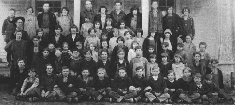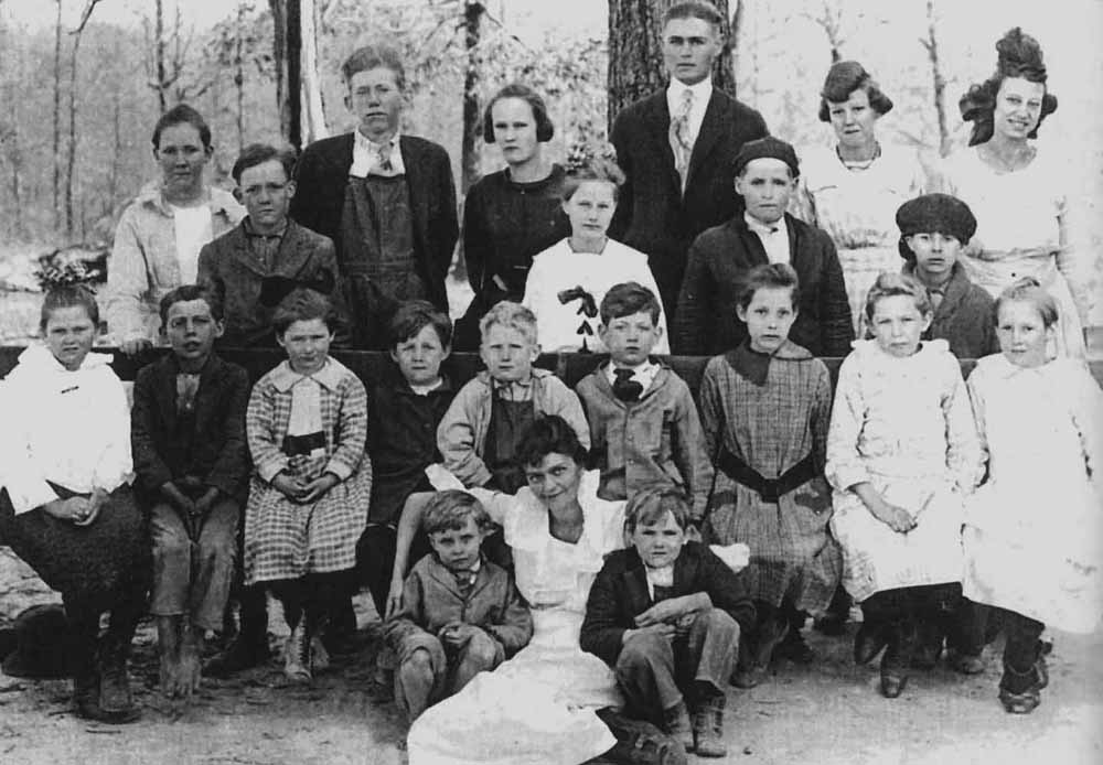 Mt. Gilead School in 1920. Back row left to right: Addie Mae Thomas, Valous Bush, Ruth Coffman, Lucian Cook, Opal James, Bertha Stewart. Second row left to right: Buck Thomas, Opal Rainey, Roy Herron, Shelly O'Brien. Sitting on bench left to right: Fronia Rainey, Jack Stewart, Willie Coffman, Eddie D. James, Henry Coffman, Albert Cook, Ilene Lovell Tucker, Ocie James, Ruby Thomas. Sitting on ground left to right: Henry Cook, Ms. Ione Lister (teacher), Clem Rainey. The bench was borrowed from church (Photo-Prentice Page)