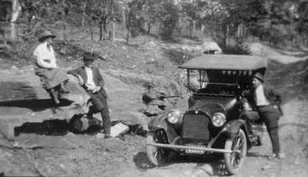 Thomas Albert Hare stands with his foot on the running board of his "sporty cat" at a site that resembles a location in Natchez Trace State Park. The boys in the community envied him for his Overland automobile.