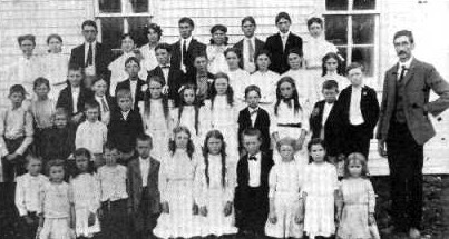 Alberton School, 1904. The teacher was William On-is Smith. Back row, from left are Donnie Azbill, Eva Small, Al Jowers, Josie Lindsey, May Roberts, Logan Azbill, Callie Roberts, Onie Small, Luther Jowers, Effie Lindsey, (second row) Walter Overman, Alfred Jowers, Jean Jowers, Tom Stanford, Florence Jowers, Ellis Small, Louella Griggs, Lizzie Roberts, Allie Roberts, Lessie Lindsey, (third row) Willie Roberts, Gene Azbifl, Duncan Roberts, Ruby Jones, Ada Cozart, Linnie Roberts, Alton Griggs, Lizzie Jowers, Oscar Roberts, Ronnie Jowers, (front row) Chester Lindsey, Gertrude Roberts, Doe Jowers, Neva Lindsey, Minnie Roberts, Chester Woods, Casey Overman, Lula Small, l3eulnh Roberts. (Photo furnished by John Cozart.)