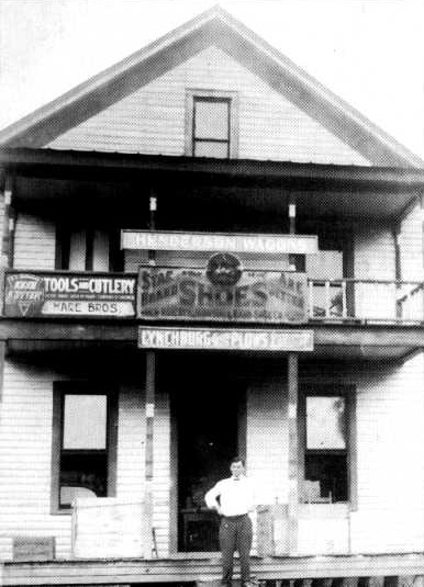 Store clerk Case Hancock stands in front of Hare Bros. General Merchants store at Alberton. Mr. Johnny, expert in retailing, operated using "Hare money." The store, established in 1895, had expanded in 1905 to the manufacture and sale of buggies. They stocked Tennessee, Studebaker and Fisher Bros. wagons and carried full lines of dry goods, groceries, hardware, farm implements and vehicles at Alberton and their location in Yuma. (Photo furnished by Debbie Blare.)