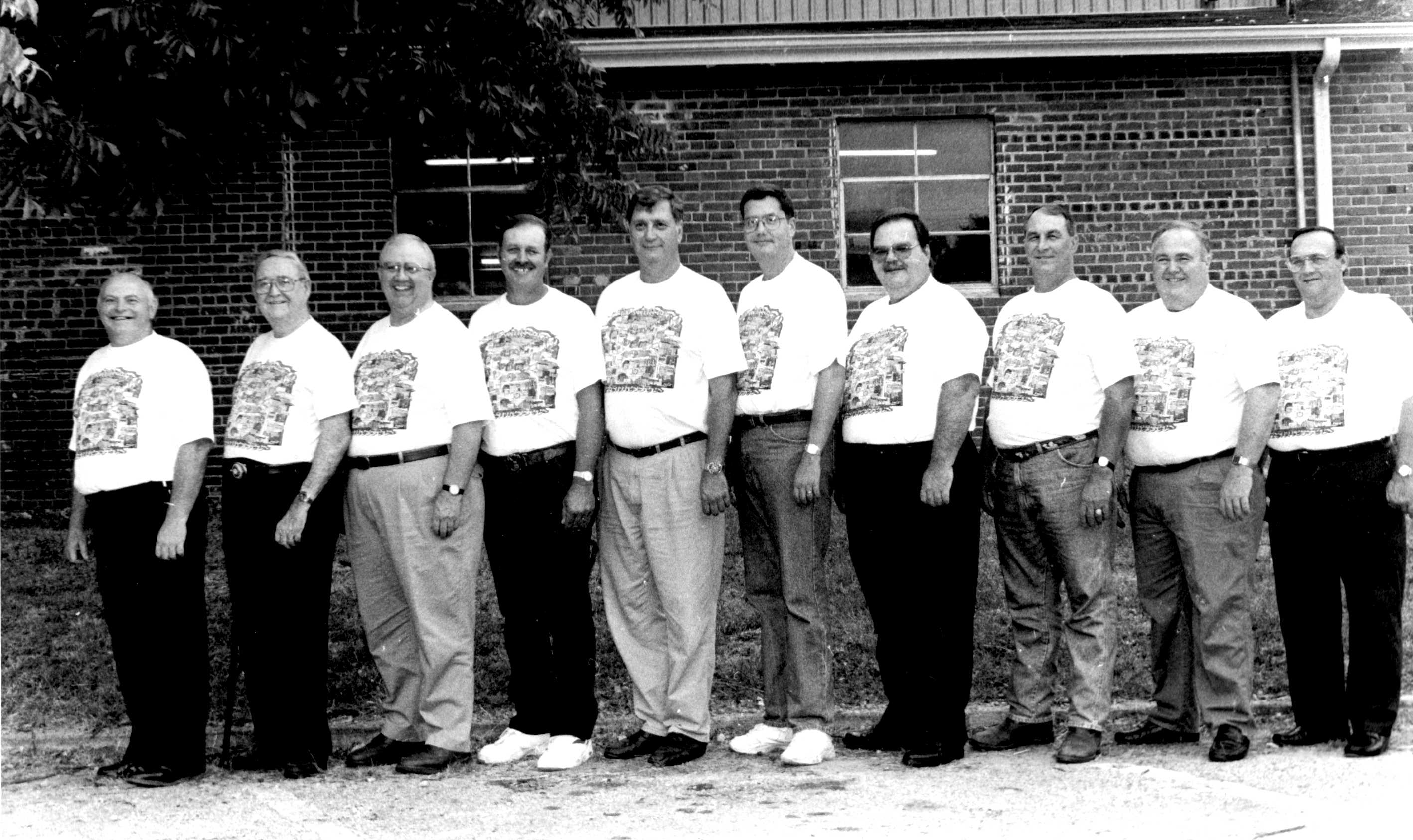 To promote the shirts ten big-hearted men around town have posed for a "Big Ten" photograph wearing the shirts. The picture is a take off on a publicity stunt once conducted by a Lexington druggist, W.A. Lawler, to advertise his special tonic. Mr. Lawler was a registered pharmacist, first in business with his uncle, C.F. McHaney, who had a drugstore from 1884 until 1913 in the store now occupied by Frizzell Shoes. Mr. Lawler then started the Elk Pharmacy, which he and his wife operated for years at the location of First Bank. (They retired in 1942.)