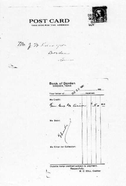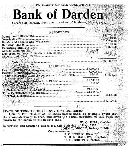 The following is a statement of the condition of the Bank of Darden at the close of business May 5, 1922. The statement was published in the May 19, 1922, issue of the Lexington Progress.