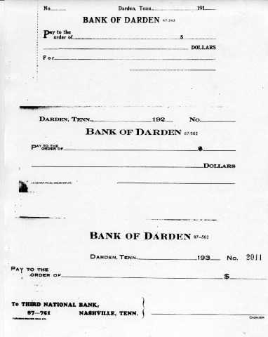 The bank of Darden was established in 1913 and operated into the 1930s when it was closed by federal bank regulators. L. B. Moore and W. O. Hill were the bankers. The bank was located across the road from the stores in Darden. In 1986 the old bank building was in ruins.