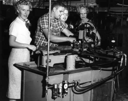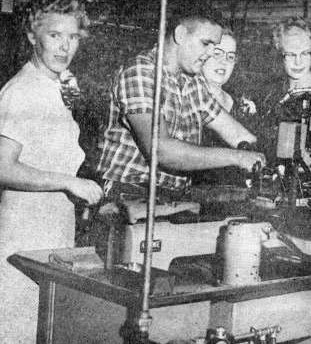 HARDING'S DAY — Employees of Harding Machine Screw Co.'s plant in East Liberty, Ohio, were treated to real Southern hospitality here last Wednesday as semi-formal ceremonies noting the Lexington plant's fourth anniversary were held. The Ohioans, all with more than 15 years service, were flown here and mingled with Lexington workers. Jerry Neal Lewis demonstrated one of the machines in the Lexington plant [middle of three photos above]. In a formal pose, Mr. and Mrs. Paul Blackburn, owners or the company, were photographed in front of g the plant along with Mayor Jack Hay and Mr. and Mrs. Bussel Lockwood. Later, Mr. Blackburn outlined the firm's history to employes of both plants as well as invited guests.
