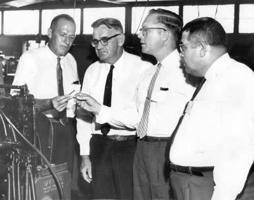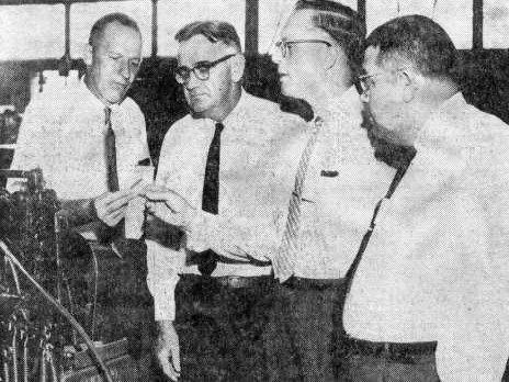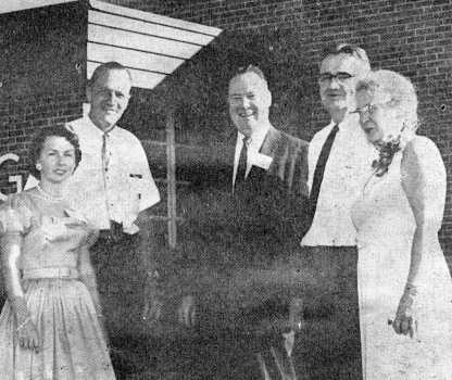 LEXINGTON DEDICATION — A 65-employee delegation from the East Liberty, Ohio plant of the Harding Machine Screw Co., led by the company president. Paul T. Blackburn (second from left) were in Lexington Wednesday afternoon to help the local plant dedicate the recently completed plant expansion and celebrate four years of successful operation. With the president in the above picture are (left to right) Russel Lockwood, Lexington plant manager; Dick Barry, attorney and state legislator; and Henderson County Judge Clyde M. Reeves. In pointing out the expansion at Lexington, Blackburn said production has jumped from 8',4 million parts in 1955-56 to approximately 27 million this year.