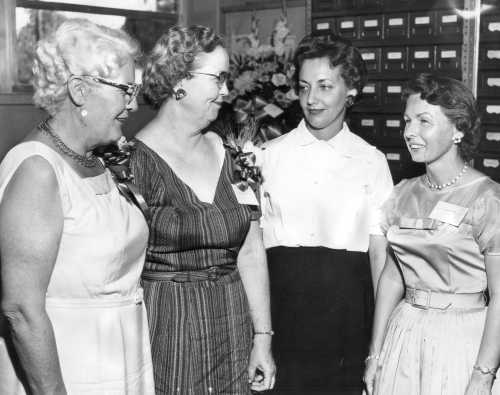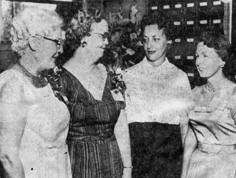 RECEPTION — Among those greeting the Lexington and Ohio company employees and their families at the Harding Machine Screw Co. plant expansion dedication at Lexington Wednesday afternoon were Mrs. Paul T. Blackburn (left) wife of the company president; and Mrs. Russel Lockwood (right), wife of the Lexington plant manager. They are shown talking with Miss Marguerite Hindall (left center), a 25-year employee at the East Liberty, Ohio plant, and Mrs. Reba Booth, who has been employed at the Lexington plant since It was established four years ago.