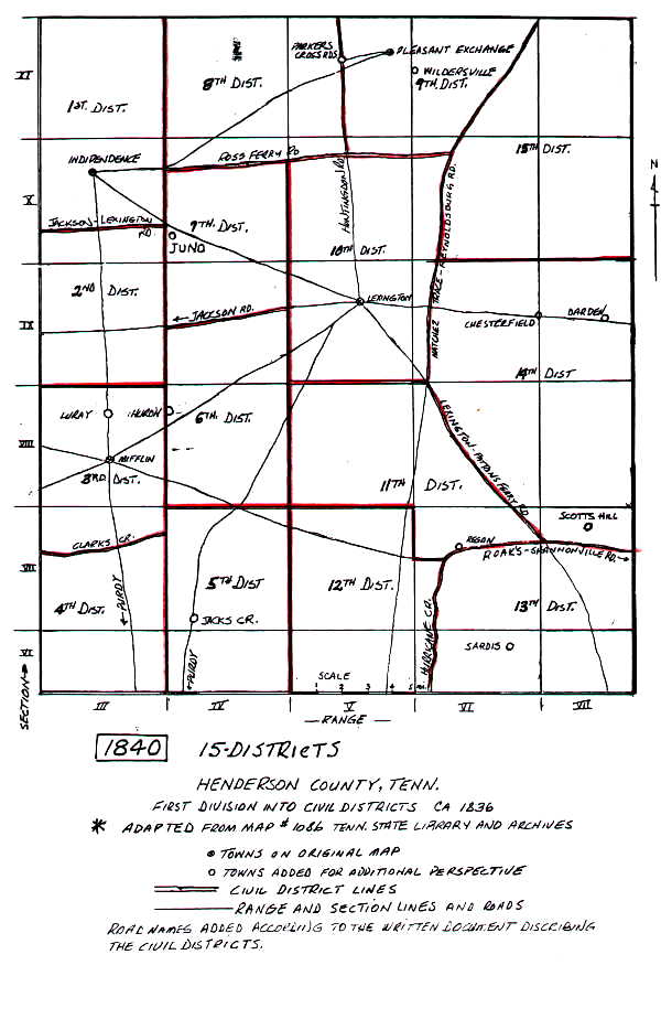 The 8th district shall begin at the North West corner of the 11th. section of the 4th. ranges and 9th. surveyors district, running thence south with the range line dividing ranges three and four to where it intersects the old Ross Ferry Road, thence East with said Road to where it intersects the road leading from Lexington to Huntingdon by the way of Parkers thence north with Huntingdon with said road to the north boundary of Henderson County, thence West to the beginning. The elections to be held at the house of Williams.