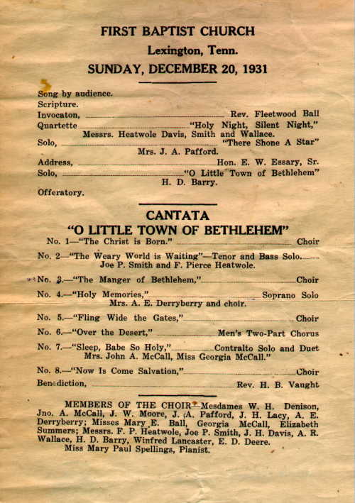 The following miscellaneous newspaper clippings and other items were found in a scrapbook compiled by the Imogene Oakley. Sources for the newspaper clippings are not given identifiable sources are The Lexington Republican, the Lexington Progress, and the Jackson Sun. Handwritten dates in the scrapbook for the most part seem to be the date of the event being mentioned and not the date of publication. The scrapbook is now owned by Brenda Kirk Fiddler.