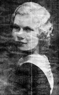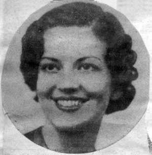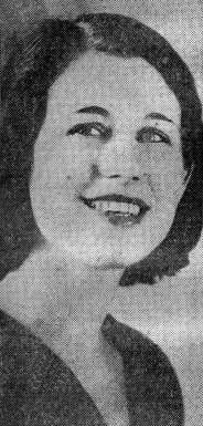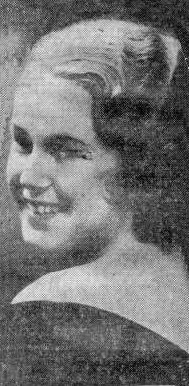 Miss Ball looked lovely in an original model of white chiffon, encircling the bodice. Her only ornament was a rhinestone clip that she wore in her hair. Her corsage was of red roses.
